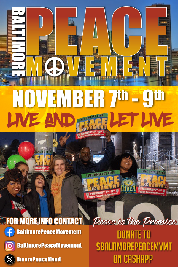 If you have a life-affirming event in 2025 that is not happening during a Peace Promise Weekend, and you want it to be in participation with the Baltimore Peace Movement, please click here to complete this form, and it will be added to the calendar.